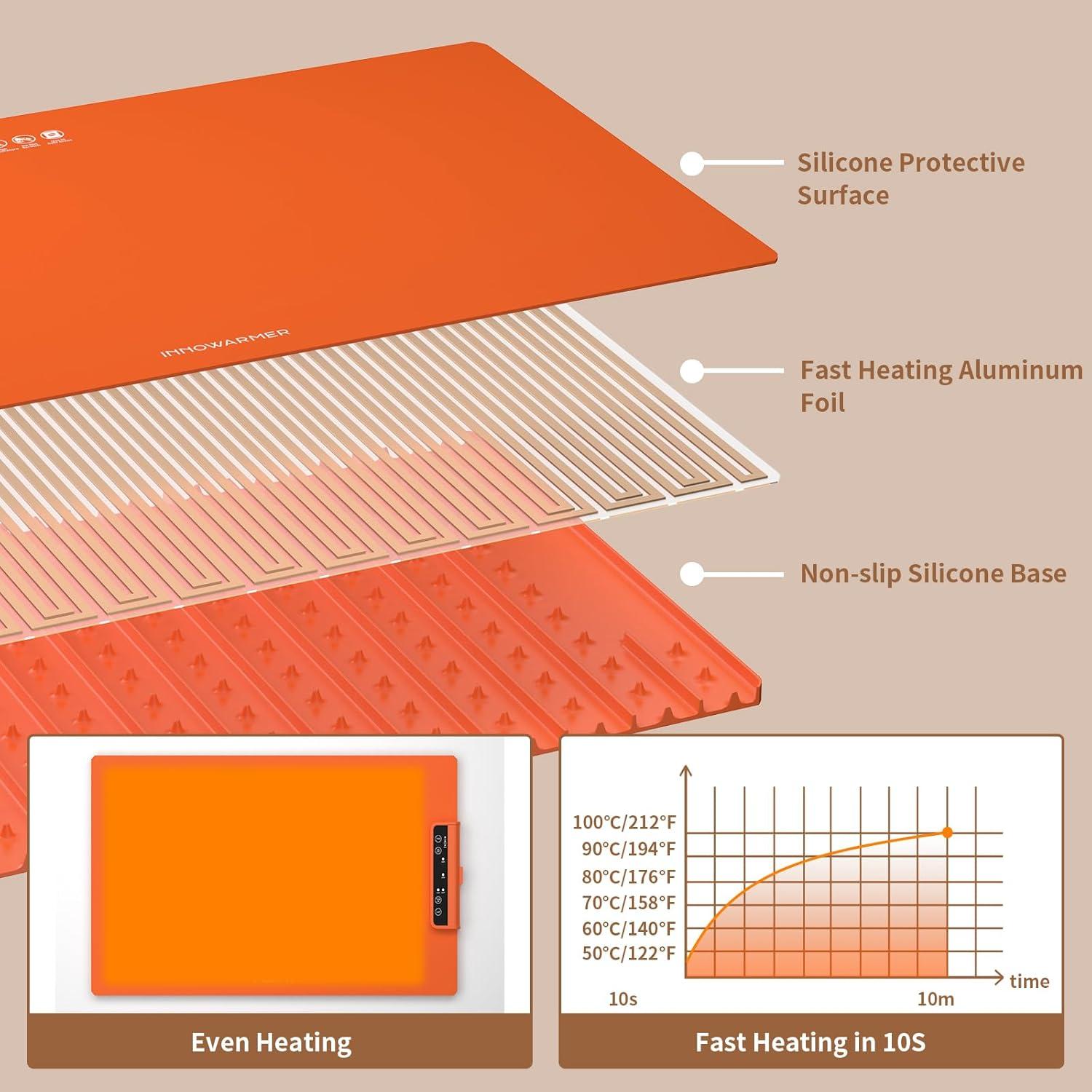 10s Rapid Full-Surface Heating: Innowarmer electric food warming mat is equipped with a 240W aluminum foil heating film and adopts advanced directional heating technology. It can achieve uniform and rapid heating of the entire mat in just 10 seconds. Encased in flexible, food-grade silicone, it is safe and won't damage or mark your table.