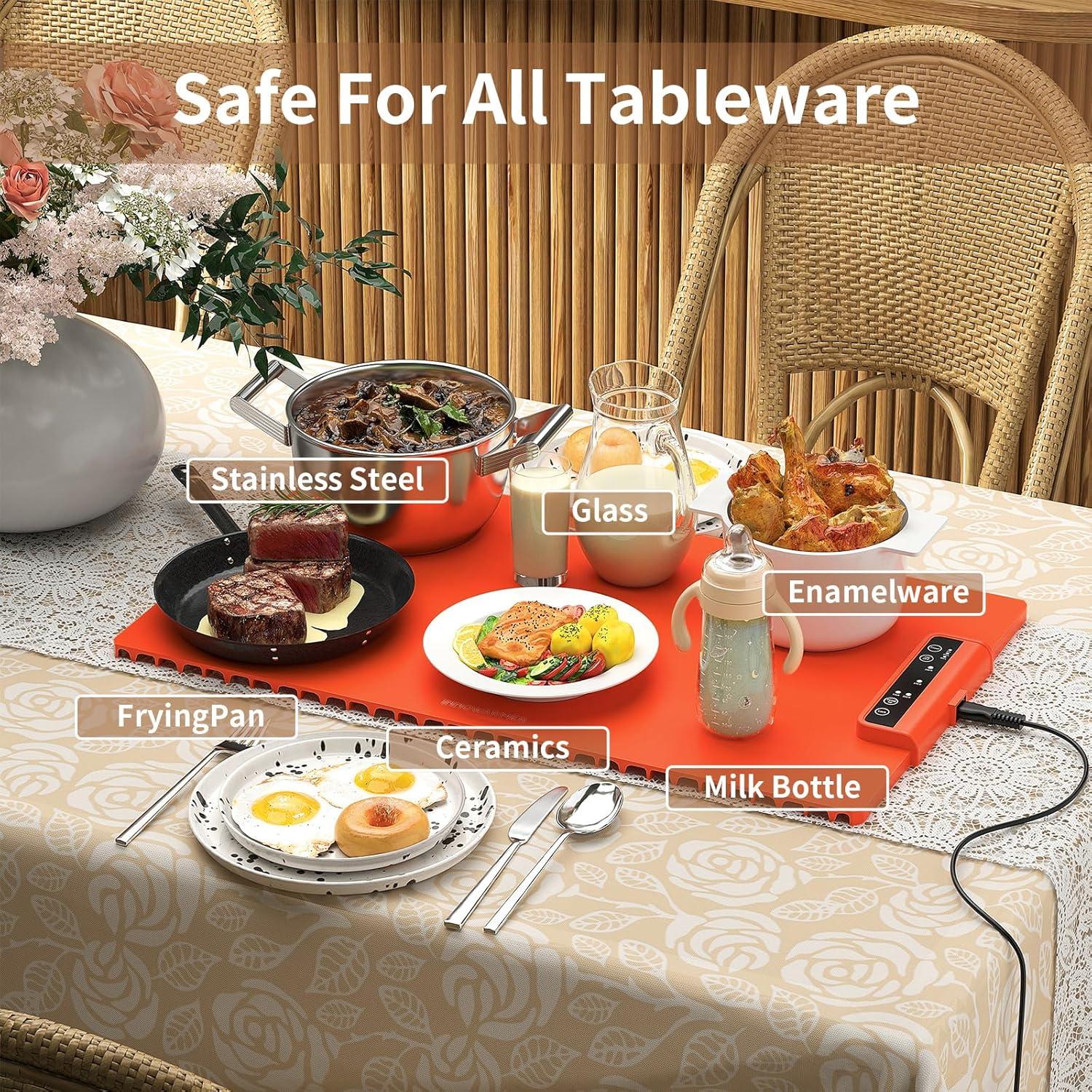Safe for All Dishes: Measuring 15 x 24 x 0.35 in, it can warm 6 entrees or appetizers simultaneously. Safe for glass, stainless steel, iron pot, ceramic, casserole, it's ideal for warming bbq, roast, vegetable or any hearty meal! Whether for family gatherings or daily meals, the electric food warmers will keep the food at the perfect temperature, fresh, and flavorful!